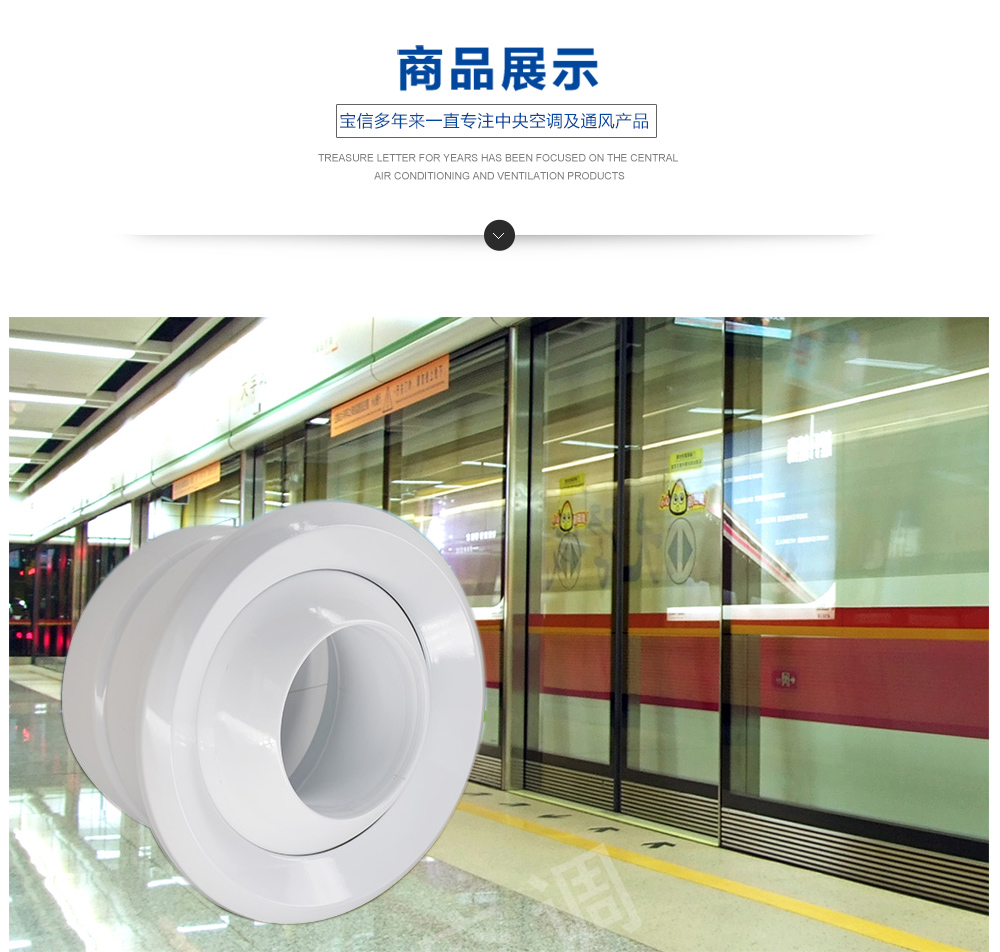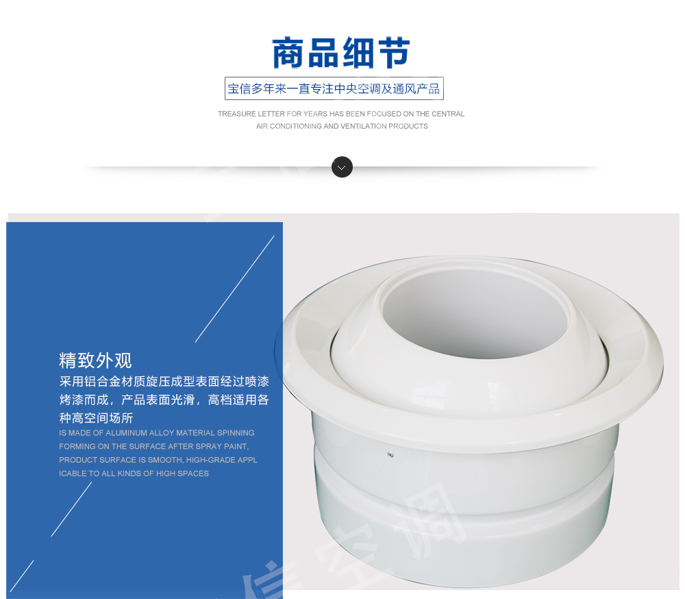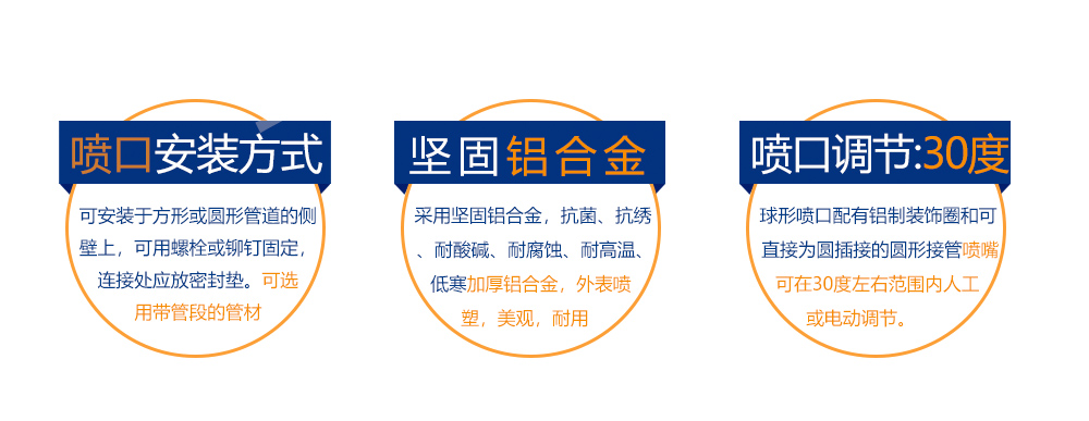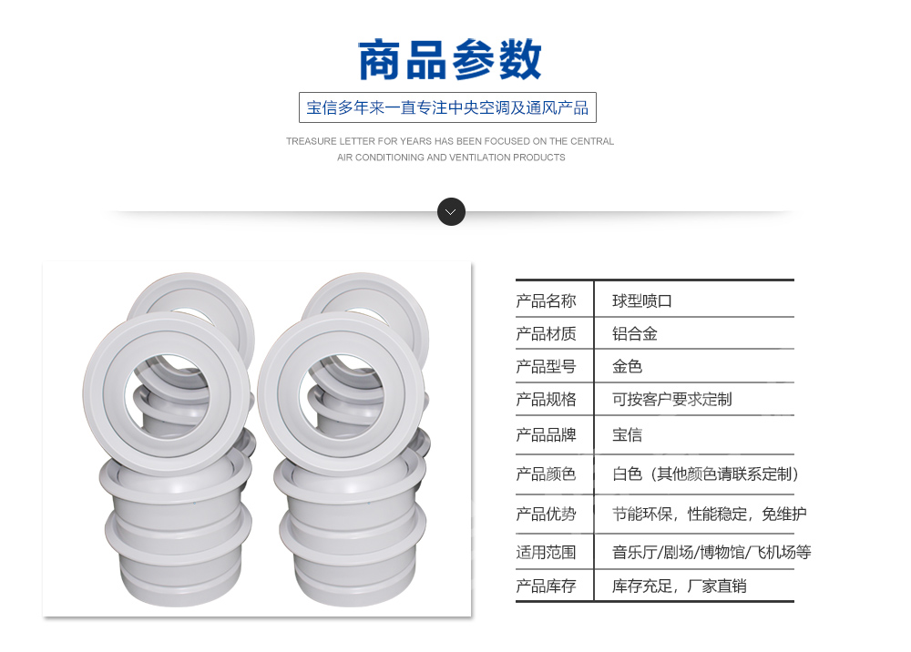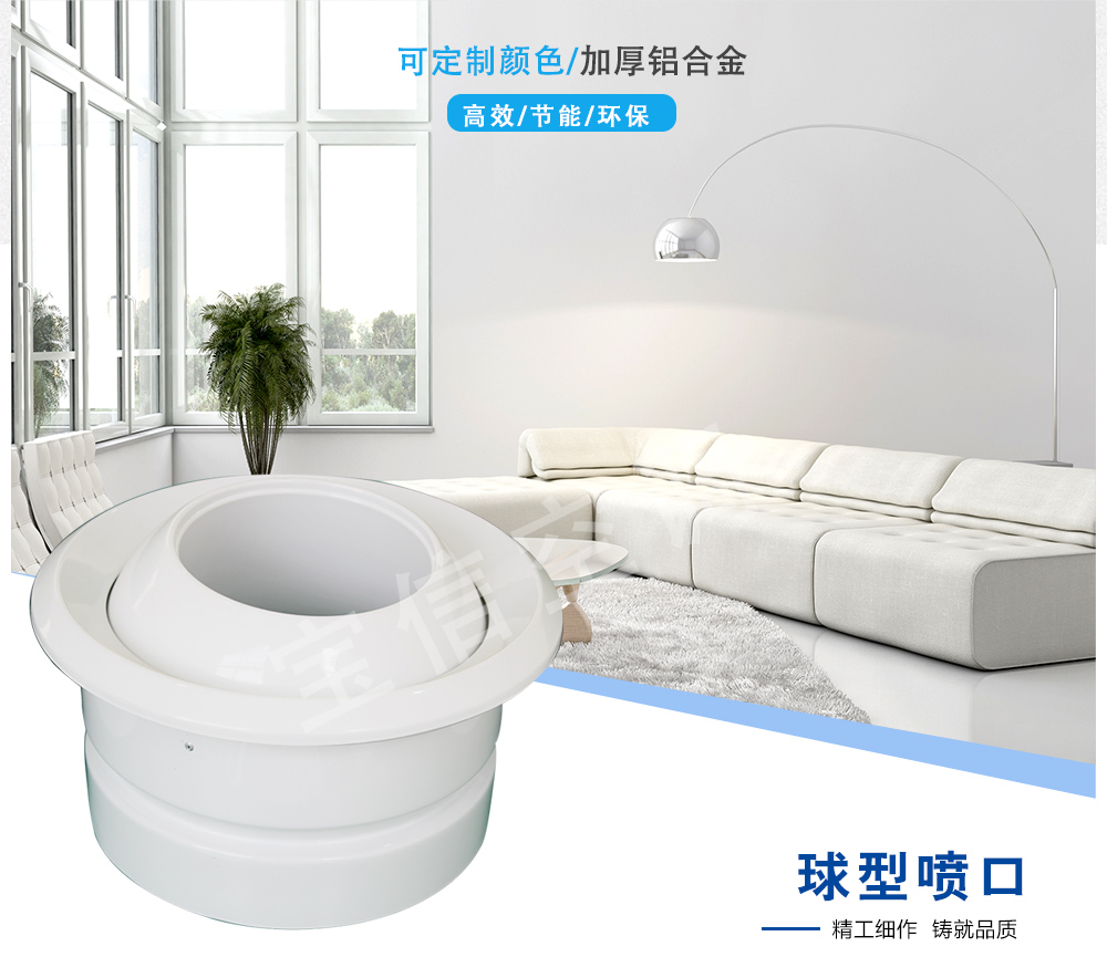 球形可調風口是一種噴口型送風口,高速氣流在經過閥體噴口中對指定方向送風,氣流噴射方向可在頂角為35°的圓錐形空間內前后左右方便地調節,氣體流量也可通過閥門開合程度來調節。造用于高大層頂高速送風或局部供冷的場合,如機場候機大廳,室內體育場,賓館廚房等場合。