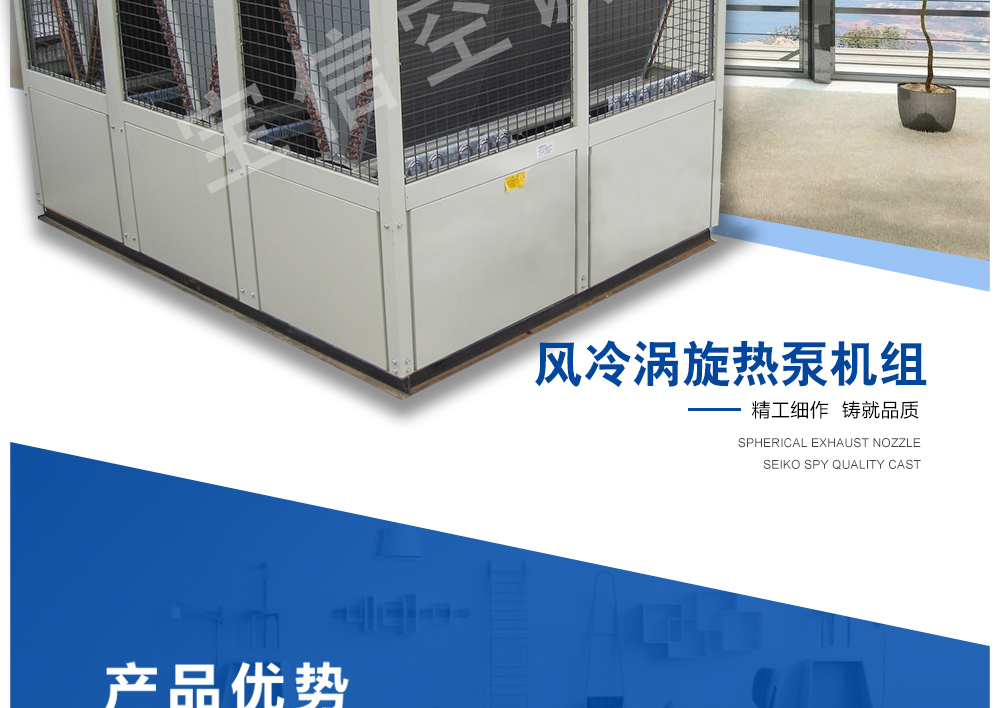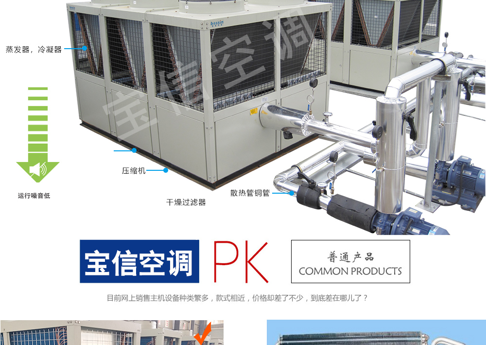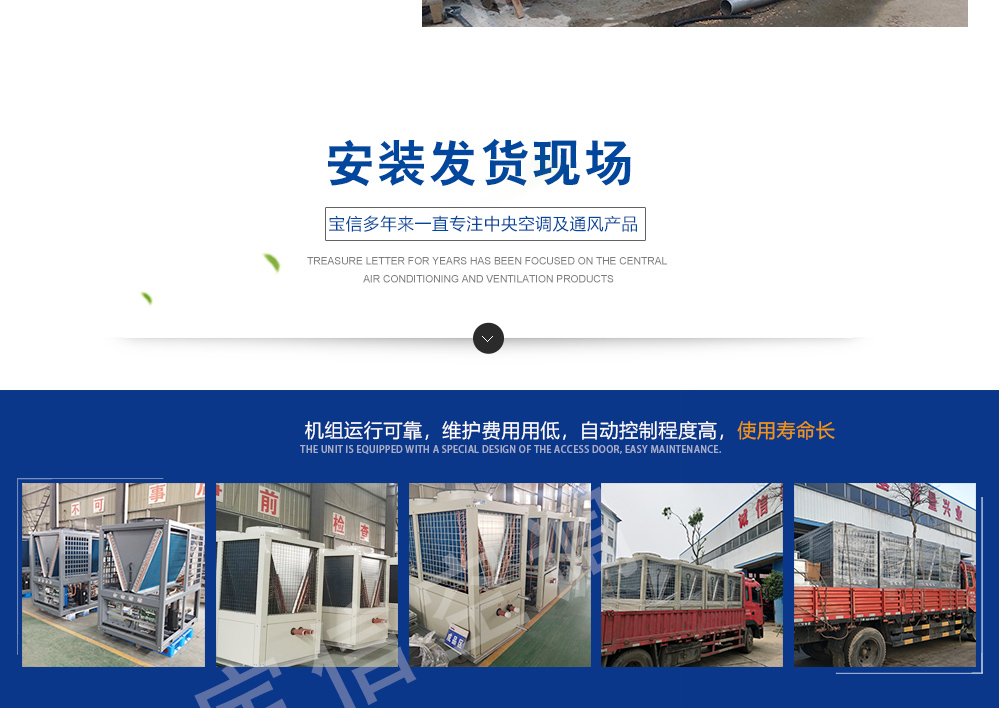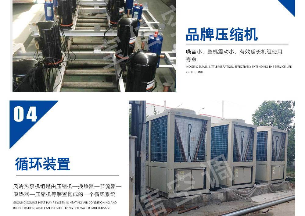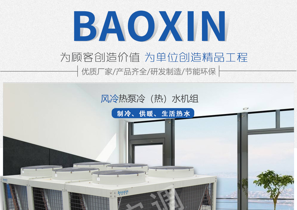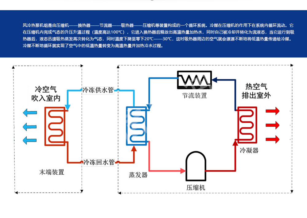 風(fēng)冷熱泵機(jī)組是由壓縮機(jī)——換熱器——節(jié)流器——吸熱器——壓縮機(jī)等裝置構(gòu)成的一個(gè)循環(huán)系統(tǒng)。冷媒在壓縮機(jī)的作用下在系統(tǒng)內(nèi)循環(huán)流動(dòng)。它在壓縮機(jī)內(nèi)完成氣態(tài)的升壓升溫過(guò)程(溫度高達(dá)100℃),它進(jìn)入換熱器后釋放出高溫?zé)崃考訜崴瑫r(shí)自己被冷卻并轉(zhuǎn)化為流液態(tài),當(dāng)它運(yùn)行到吸熱器后,液態(tài)迅速吸熱蒸發(fā)再次轉(zhuǎn)化為氣態(tài),同時(shí)溫度下降至零下20℃——30℃,這時(shí)吸熱器周邊的空氣就會(huì)源源不斷地將低溫?zé)崃總鬟f給冷媒。冷媒不斷地循環(huán)就實(shí)現(xiàn)了空氣中的低溫?zé)崃哭D(zhuǎn)變?yōu)楦邷責(zé)崃坎⒓訜崂渌^(guò)程。