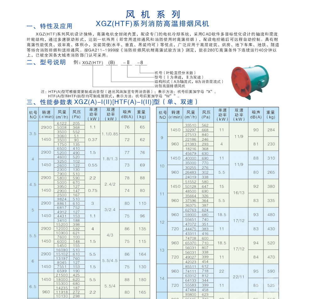 XGZ(HTF)系列消防高溫排煙風機適用于高層建筑、地下建筑及隧道、烘房等通風換氣機或高溫排煙。能在280℃高溫條件下連續運轉30分鐘以上,介質溫度100℃條件下連續運行20小時/次不損壞,是理想的消防必備設施。