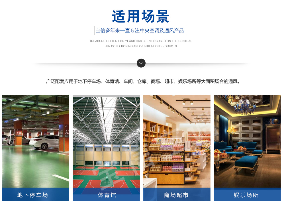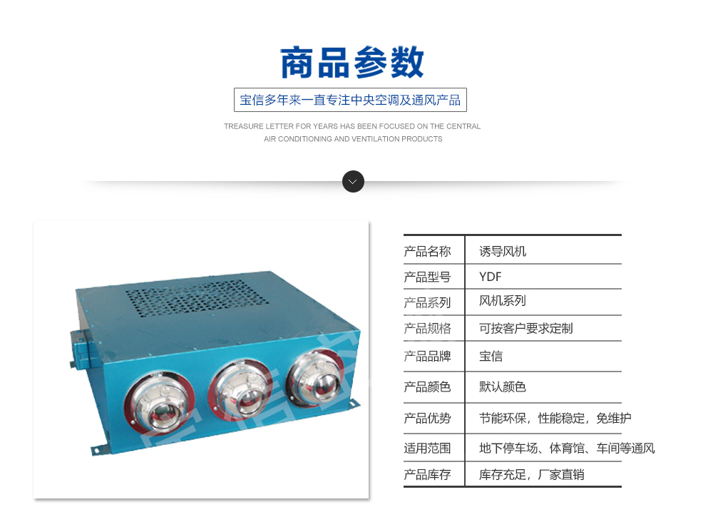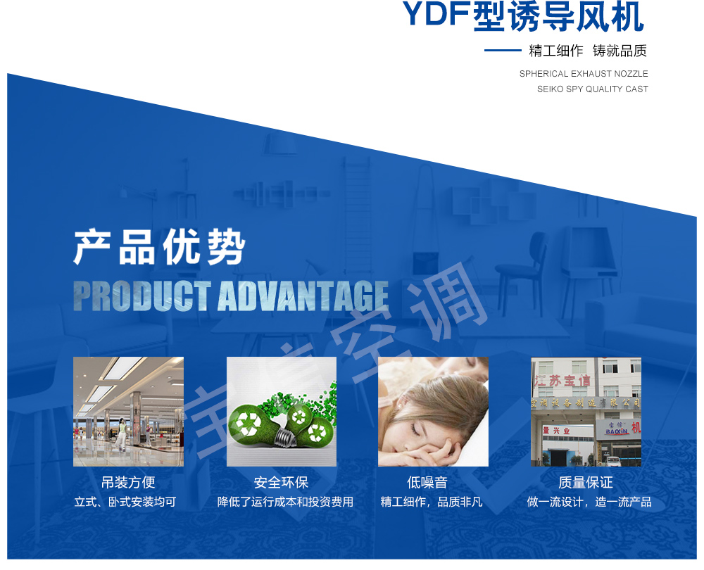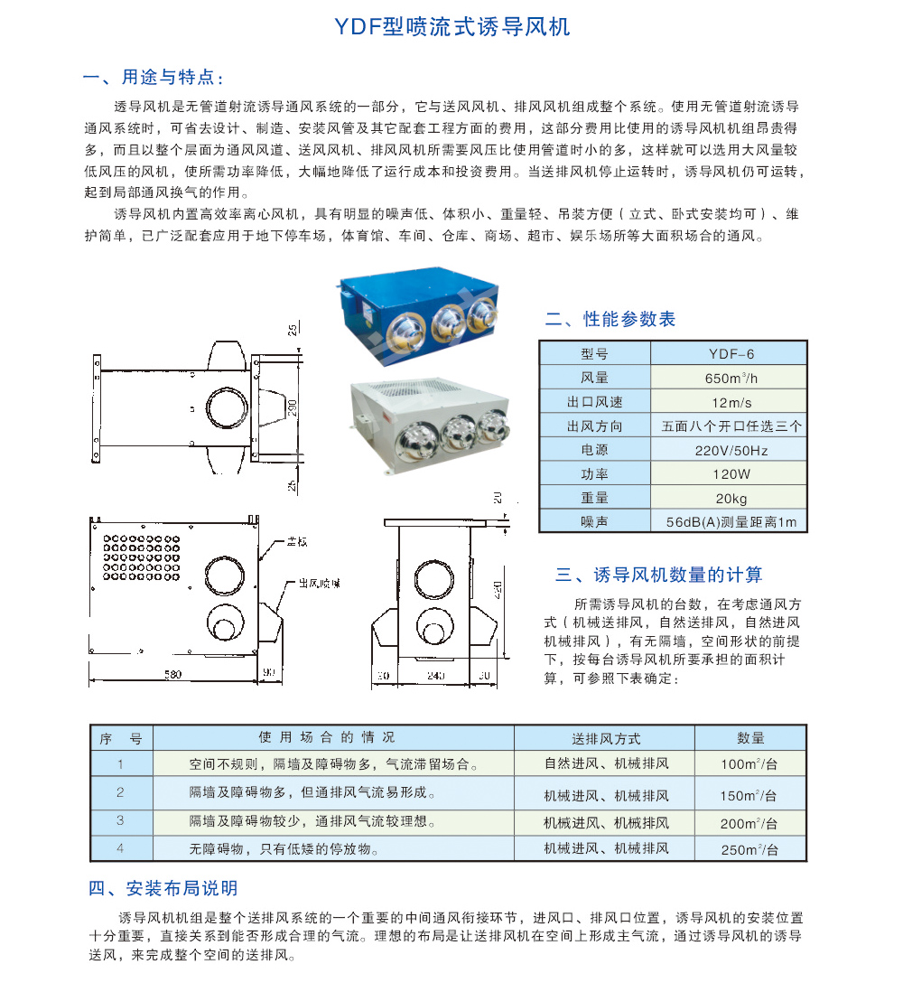 誘導風機是無管道射流誘導通風系統的一部分,它與送風風機、排風風機組成整個系統。使用無管道射流誘導通風系統時,可省去設計、制造、安裝風管及其他配套工程方面的費用 ,這部分費用比使用的誘導風機機組昂貴得多,而且以整個層面為通風風道、送風風機、排風風機所需要風壓比使用管道時小得多,這樣就可以選用大風量較低風壓的風機,使所需功率降低,大幅地降低了運行成本和投資費用。當送排風機停止運轉時,誘導風機仍可運轉,起到局部通風換氣的作用。