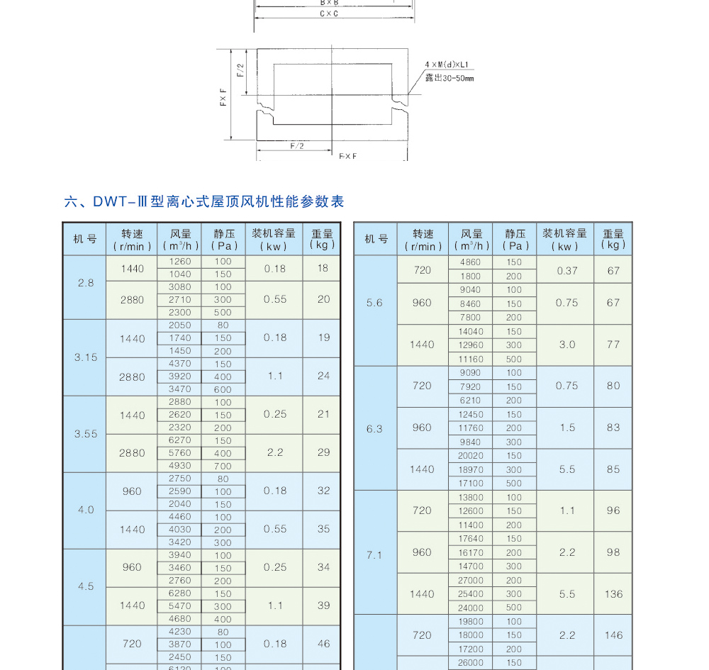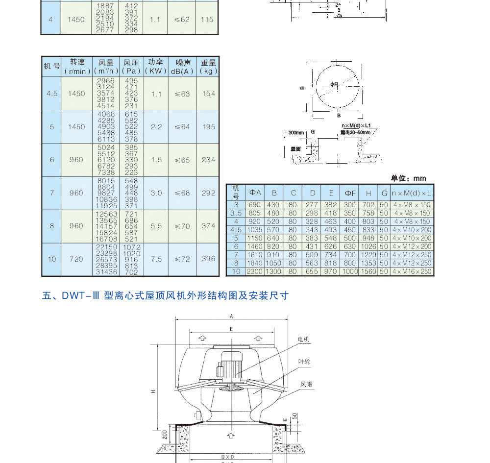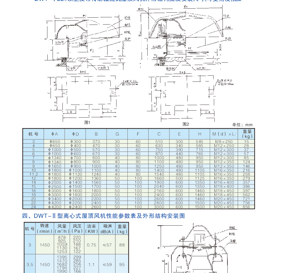 b、離心式屋頂風機:型號為DWT-Ⅱ型、DWT-Ⅲ型二種型式,宜適用于風量較小而壓力要求較高的場合。