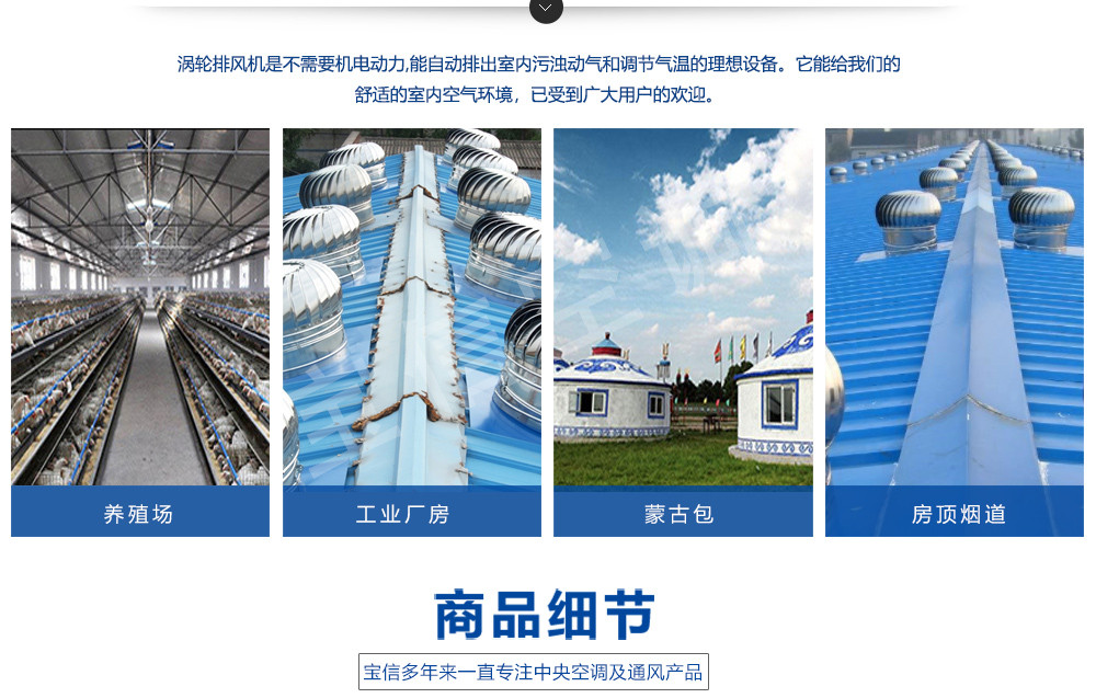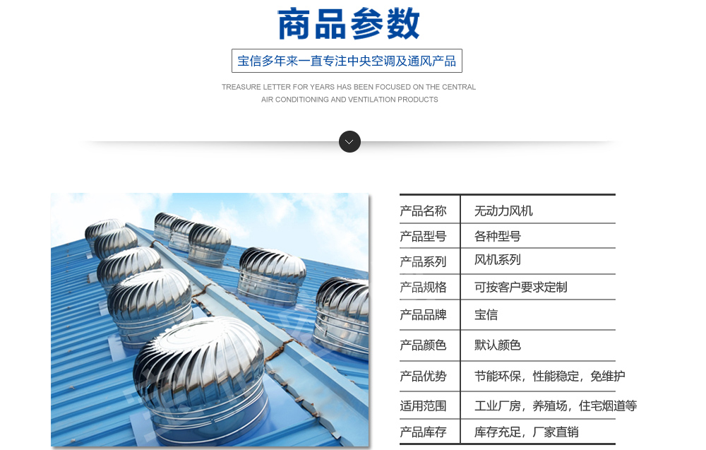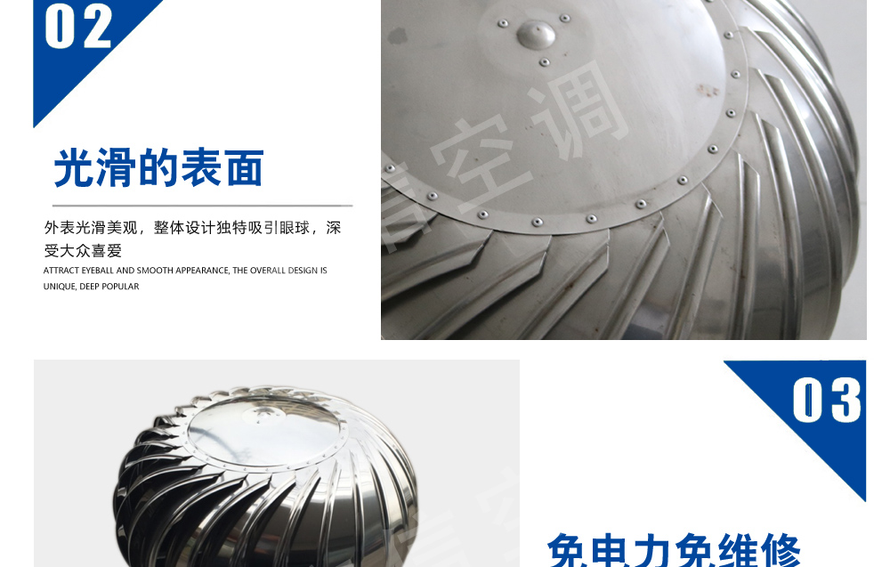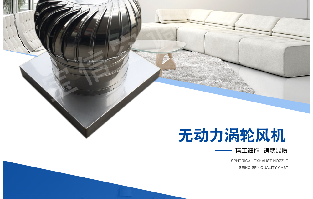 的原理,將任何平行方向的空氣流動,加速并轉變為由下而上垂直的空氣流動,以提高室內通風換氣效果的一種裝置。該風機不用電,無噪音,可長期運轉。其根據空氣自然規律和氣流流動原理,合理化設置在屋面的頂部,能迅速排出室內的